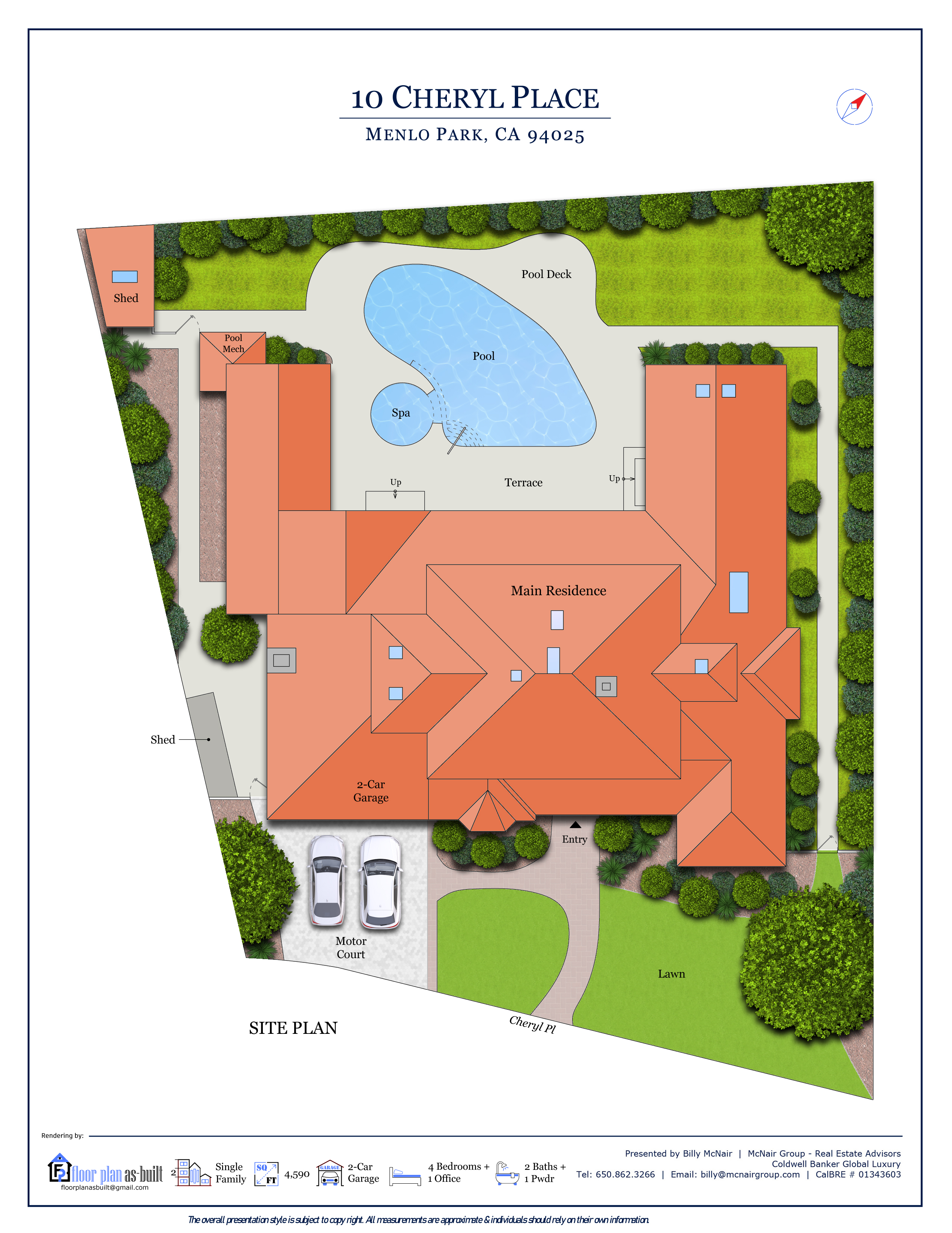 Tucked away on a quiet cul de sac in prime Central Menlo Park, this expansive 5-bedroom, 3.5-bath lease offers approximately 4,340 square feet of living space on an 11,583 lot just blocks from downtown. The two-story home features a formal living room with fireplace, elegant dining room, and a generous family room with fireplace and built-in bar -- perfect for entertaining. A separate rec/billiards room/pool house opens to the sunny backyard with a sparkling pool and spa. The chef's kitchen includes a center island, dual ovens, top stainless steel appliances, and a picture window overlooking the front yard. The main level offers a spacious primary suite and an ideal guest bedroom or home office. Upstairs there are three large bedrooms with walk-in closets and a shared bath. Filled with natural light from picture windows throughout, this home is close to Stanford University, Palo Alto, Sand Hill Road, leading Silicon Valley tech campuses like Meta, and top private schools including Menlo School and Sacred Heart. Located in the acclaimed Menlo Park School District.